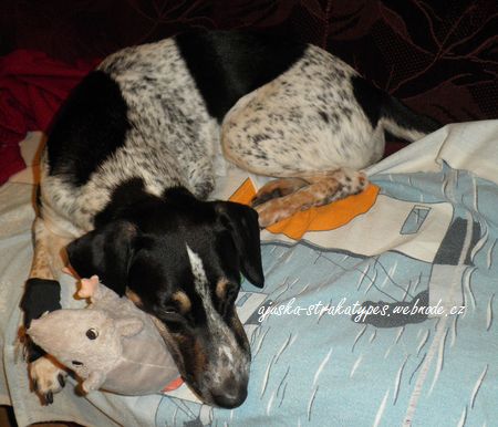 Návštěvní maraton je naštěstí už za námi. Teprve šestadvacátého jsme byli konečně doma, ve Vlaštovčím hnízdě. Ježíšek se pochlapil, mně donesl zimní bundu a Ajce ty strašlivě drahé speciální bandáže. Už po dvou dnech nošení Ajka opravdu přestávala kulhat, přesto stále musíme dodržovat klidový režim, tlapka je pořád nateklá a hřeje, achjé, co ještě na toho magorka vymyslet, aby to vydržel... Zase se nám potvrdilo, že zničit lze strakáče i psychicky, řada návštěv ji unavila naprosto dokonale! Čtyřdenní cestování po návštěvách ji dočista odrovnalo a únavu vyspávala celý den! Největší radost jí ovšem udělala ikeácká plyšová krysa, kterou si okamžitě zamilovala a žužlá ji teď celé dny. To se zas jednou Ježíšek trefil! :o)