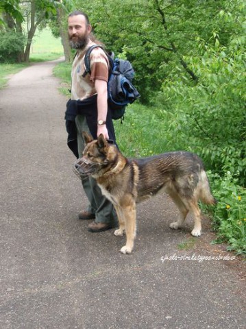 Dohodli jsme se s kamarádkou Barčou, že uděláme společnou psí vycházku. Domluvili jsme se tak, že se všichni sejdeme u Radovana v práci, až bude končit, a pak se půjdeme projít. Protože Radovan si psa vzít do práce nemůže, znamenalo to, že Ursínek půjde do práce se mnou. Když pominu to, že bylo u nás doma Ursínovi (zvyklému spát většinou v chodbě nebo když je tepleji tak venku v boudě) pěkně vedro, tak jinak se mu asi celá akce moc líbila. Ráno jsem vyrazila do práce o chvilku dřív a udělali jsme si malou vycházku kolem Svratky, popojeli jsme šalinou k Vojenské nemocnici a udělali jsme si druhou krátkou vycházku kolem Svitavy. Takže pro Usína výhoda číslo jedna: mohl občurat hned dvě různé řeky! :-) V kanclu jsem mu udělala ložiště u sloupku za mou židlí, připravenou dekou ale pohrdl a raději ležel na kachličkách těsně za mnou, aby měl přehled o tom, co dělám. Očekávala jsem komplikace po příchodu prvních spolupracovníků cca. dvě hodiny po nás, Ursín je přece jenom především hlídací pes. Nespletla jsem se. Ubohý náš Sam, pomocník pro všechno a obrovský milovník psů, má doteď z Ursína trauma, že se neskamarádili. Oni by se skamarádili, potkat se někde venku, ale když Sam přišel do práce, Ursín už pojal moji kancelář za své teritorium a hlídal, jak nejlépe to uměl. Opravdu. Štěkal a štěkal a byl k neutišení, neplatilo na něj nic. "Tohle je naše území a někdo sem leze, HAF!" A v tomto duchu se nesl celý den, kdykoliv to vypadalo, že někdo ze zákazníků nebo jiných bytostí pohybujících se po obchodě zamíří k nám do kanceláře, Ursín začal štěkat. A výsledek? Celý den za mnou nepřišel šéf a žádné zvláštní úkoly mi nezadal, jen opatrně nakukoval zpoza dveří! :-D Čili nejen pro Ursínka, ale i pro mě měl tento výlet značné výhody! Na milost vzal Ursínek jenom Bohďu, naši prodavačku, která ho při prvním potkání uplatila piškotem, co zrovna jedla, a pak také našeho pošťáka a to naprosto nechápu proč, protože jinak na každého chlapa hrozně řval. Buď si ho nevšiml a pak už mu bylo blbý štěkat když už byl pošťák stejně uvnitř, nebo se mu prostě tenhle pán z nějakého důvodu zalíbil. Samotná vycházka pak byla poměrně krátká, protože se ještě brzo stmívalo, takže jsme udělali jen okruh mezi poli a Slatinou. Tam jsme se i zastavili v jedné místní hospůdce, pan hostinský nám psy povolil vzít dovnitř, ale hned jim přeměřil délku hřbetu, prý že jde najít dost velký pekáč... ;-) Dobře a levně jsme pojedli (ale raději smažený sýr) a pak už byla tma, tak jsme prchli domů.